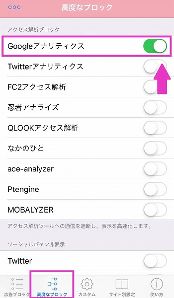 ⑤『高度なブロック』を選択し『Googleアナリティクス』をONにします