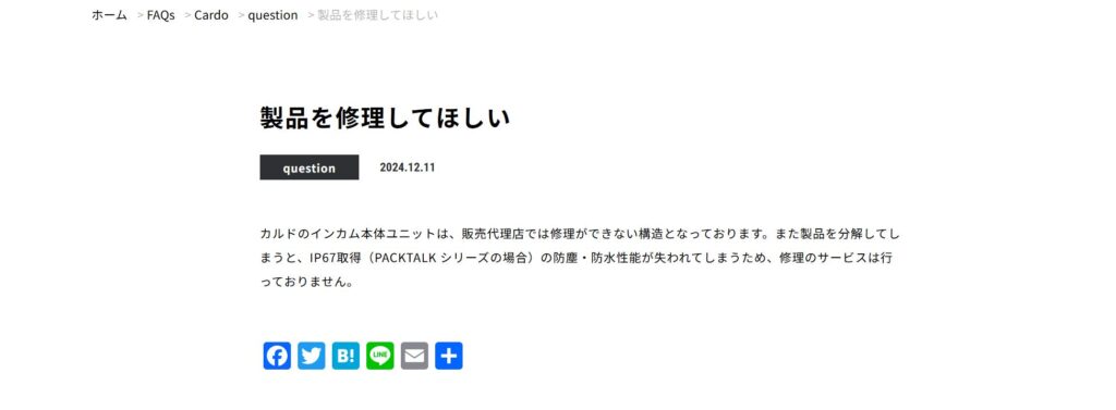 ただ、正規代理店品のアーキサイトのHPには「カルド本体は修理ができない構造となっているので修理は行っていない」と書いてありました。