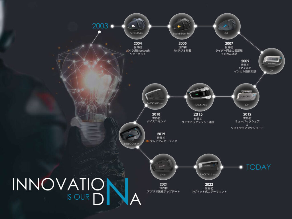 2004年に世界初の "Bluetooth対応オートバイ用ワイヤレスインカムヘッドセット" を発売したのち、様々な「世界初」を発表。圧倒的な技術力とライダー目線に基づいた製品開発をし続けています。